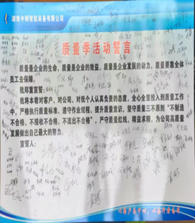 质量是一个准则,质量是一个忠诚,质量是一个责任,质量就是企业的生命。为体现质量的全员性,由分管质量的王春芳副总经理牵头,铿锵有力宣读质量活动誓言,彰显全体员工对质量卓越追求的态度和决心。宣誓完毕后,并与黎总带头签字承诺,随后员工们依次进行签字承诺:一定落实责任制,坚持做好质量管控,打好质量安全生产硬仗。