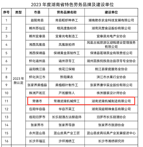 近期,湖南省人社厅确定了16个2023年度湖南省特色劳务品牌。其中,湖南武陵机械制造有限公司创立的“常德武陵机械焊工”劳务品牌荣登榜单。