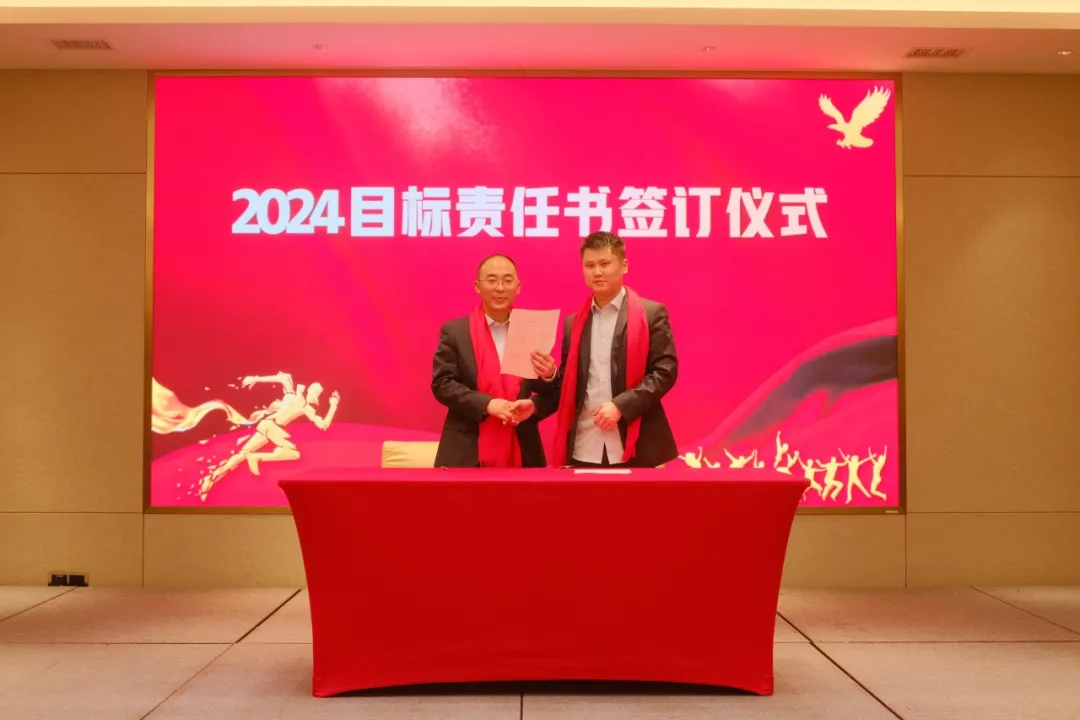 • “目标驱动、使命必达”,会上,贸易公司总经理罗晓军与销售中心各部门经理签署2024年目标责任书,明确目标责任,鼓励各部门在新的一年极致奋斗,达成目标。